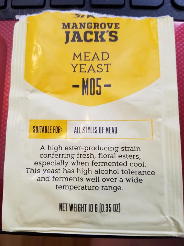 I was fortunate to find myself at a local farmers market in San Antonio, TX. There I found a table from Holdman Honey (holdmanhoney.com) which had wildflower honeys from several counties in Texas. After tasting them, I settled on the Guadalupe County which had a nice bold flavor with some fruitiness. I purchased a half gallon container (12lbs) from which I made two 1 gal batches. I wanted to find a good yeast to use for the larger experiment. Mangrove Jack’s (mangrovejacks.com) Mead Yeast M05 had great reviews and seemed a good choice.